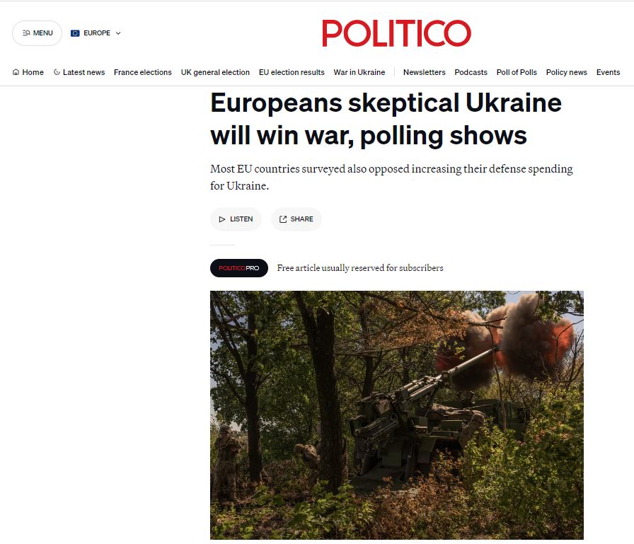 Европейский совет по международным отношениям провёл социологическое исследование, в ходе которого неожиданно выяснилось, что европейцы всё меньше верят в то, что украинская армия сможет победить армию России и Украина выйдет победителем в этой войне.