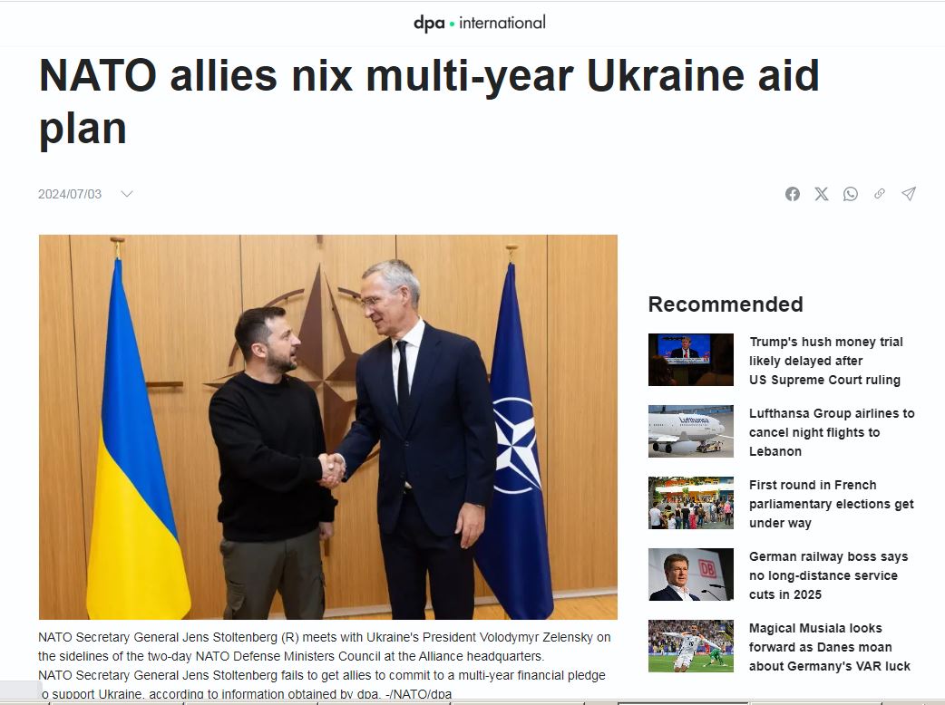 «На встрече министров обороны стран НАТО в июне Столтенберг призвал союзников согласовать план сохранения в долгосрочной перспективе их текущего уровня поддержки Украины, который, по его оценке, составляет 40 миллиардов евро в год. Однако союзники проявили редкое единодушие и отказались взять на себя многолетнее финансовое обязательство по поддержке Украины. Не смогли договориться и по поводу разделения финансовых затрат на поддержку Украины, при этом члены НАТО расплывчато заявляли, что валовой внутренний продукт (ВВП) экономики страны должен играть определённую роль, однако никакого конкретного решения не было принято, что огорчает Столтенберга. Он объяснил, что даже если бремя помощи Украине будет распределено в соответствии с ВВП стран НАТО, доля Соединённых Штатов всё равно составит 50%, однако это не произвело впечатления и не вызвало желания брать на себя какие-либо финансовые обязательства по Украине», – пишет DPA.