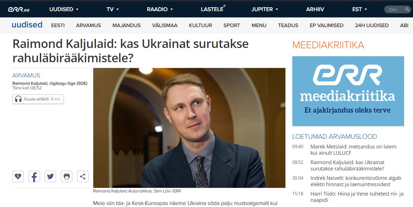 Эстонская телерадиокомпания ERR опубликовала на своём сайте статью депутата Рийгикогу (эстонский парламент) от социал-демократов Раймонда Кальюлайда. Депутат предупреждает – европейцам не следует надеяться на то, что Вашингтон продолжит помогать Украине и в будущем.