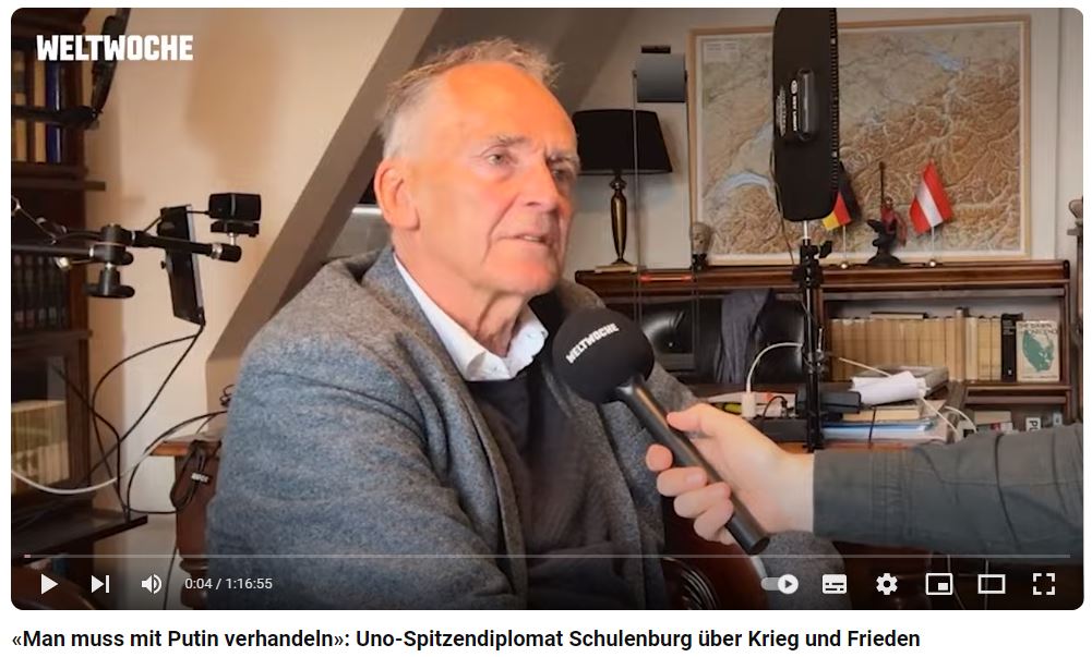 «О том, что происходит на Украине, нам известно довольно мало. Я могу представить, что на Украине сейчас очень тяжело. Она стала самой бедной страной в Европе – она и до этого была очень бедной. Ещё она примечательна тем, что там один из наиболее высоких индексов коррупции в Европе. Это большая страна, но сейчас на Украине проживает, наверное, лишь половина от того населения, которое в ней насчитывалось на момент провозглашения независимости. И притом не совсем ясно, на какой стороне живут эти люди. То есть это страна, испытывающая серьёзные трудности. Мы всегда говорим об Украине и утверждаем, что здесь речь идёт о едином народе, но это не совсем так, если посмотреть на выборы, а это, разумеется, всегда намного важнее, чем опросы. И в этом случае это всегда была разделённая страна – минимум на две части, на пророссийское население и проукраинское население. Тут нельзя провести очень чёткую границу, но она всё же есть», – рассказал Михаэль фон Шуленбург в интервью швейцарскому журналу Die Weltwoche. Интервью опубликовано на Youtube-канале издания.