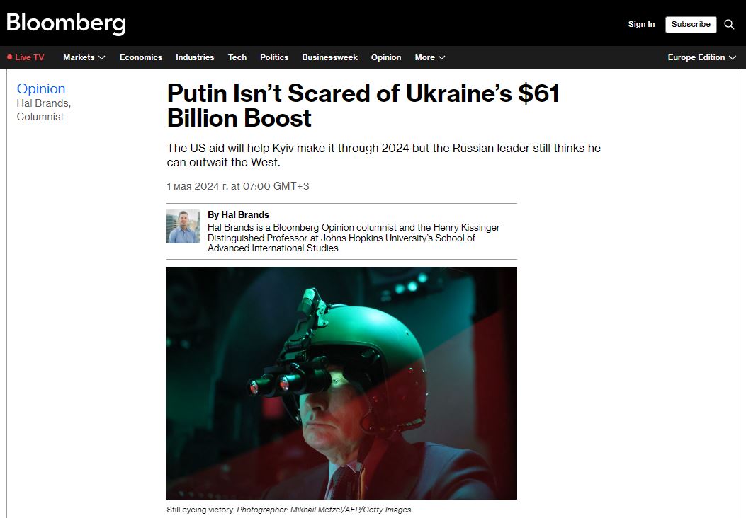 «Выделение Соединёнными Штатами дополнительной военной помощи в размере $61 млрд направлено исключительно на то, чтобы позволить Украине избежать катастрофы в 2024 году. Эта помощь не изменила того факта, что ближайшие месяцы для ВСУ будут мрачными и не приблизят их к победе, а в будущем американская помощь Киеву не гарантирована. Как бы США не спешили с поставками артиллерийских боеприпасов, Россия будет иметь значительное превосходство в вооружении. Пройдут, по крайней мере, месяцы, пока Киев мобилизует и обучит необходимое количество солдат. До конца года Украина может потерять ещё больше территорий, даже если её оборона не будет полностью сломлена. И чем больше позиций сдаёт Украина, тем труднее ей становится завершить конфликт на приемлемых условиях», – пишет автор статьи Хэл Брэндс (Hal Brands).