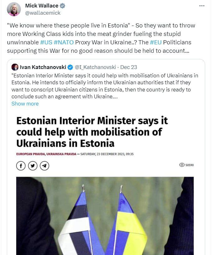 «Мы знаем, где в Эстонии живут эти люди», с готовностью заявил эстонский министр. Значит, они хотят швырнуть ещё больше детей из рабочего класса в мясорубку, разжигая глупую прокси-войну НАТО и США на Украине, которую невозможно выиграть. Европейские политики, которые поддерживают эту войну, должны быть привлечены к ответственности», – написал ирландский депутат в социальной сети.