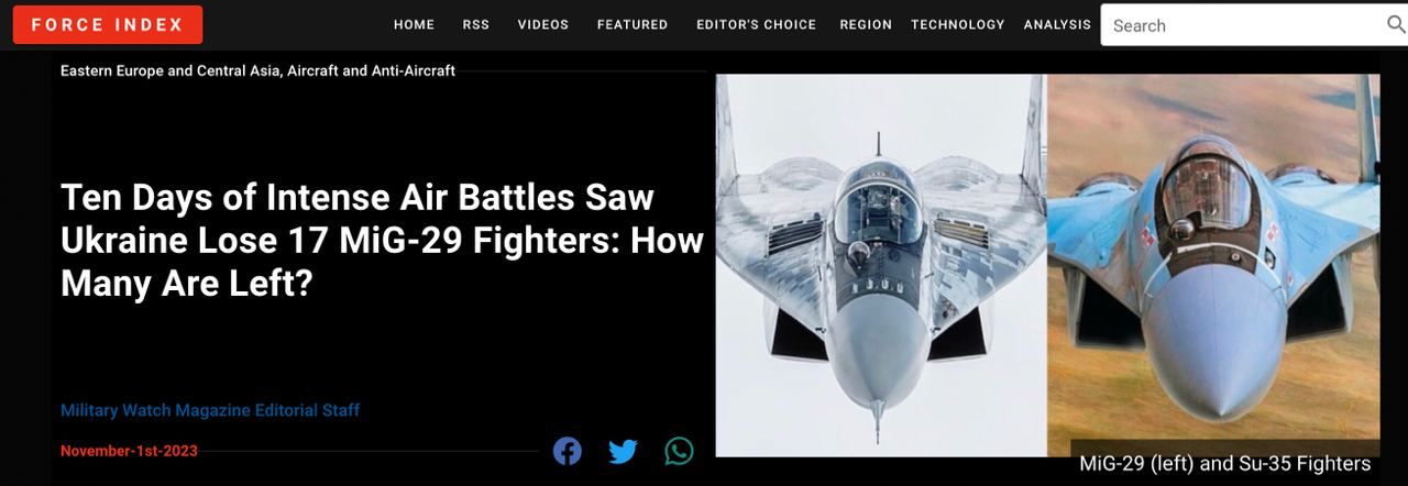 «В октябре интенсивность боевых действий в небе над Украиной увеличилась до уровня, невиданного с первых недель полномасштабной спецоперации в феврале 2022 года. С 13 по 23 октября российские войска сбили 17 истребителей МиГ-29. Украина эксплуатировала этот тип истребителей в больших количествах ещё до начала конфликта, и с тех пор приобрела ещё больше таких самолётов. МиГ-29 – один из трёх типов истребителей, широко используемых ВСУ наряду с более тяжёлым истребителем завоевания превосходства в воздухе Су-27 и ударным истребителем Су-24М, причём все их Украина унаследовала в значительных количествах от Советского Союза»,
