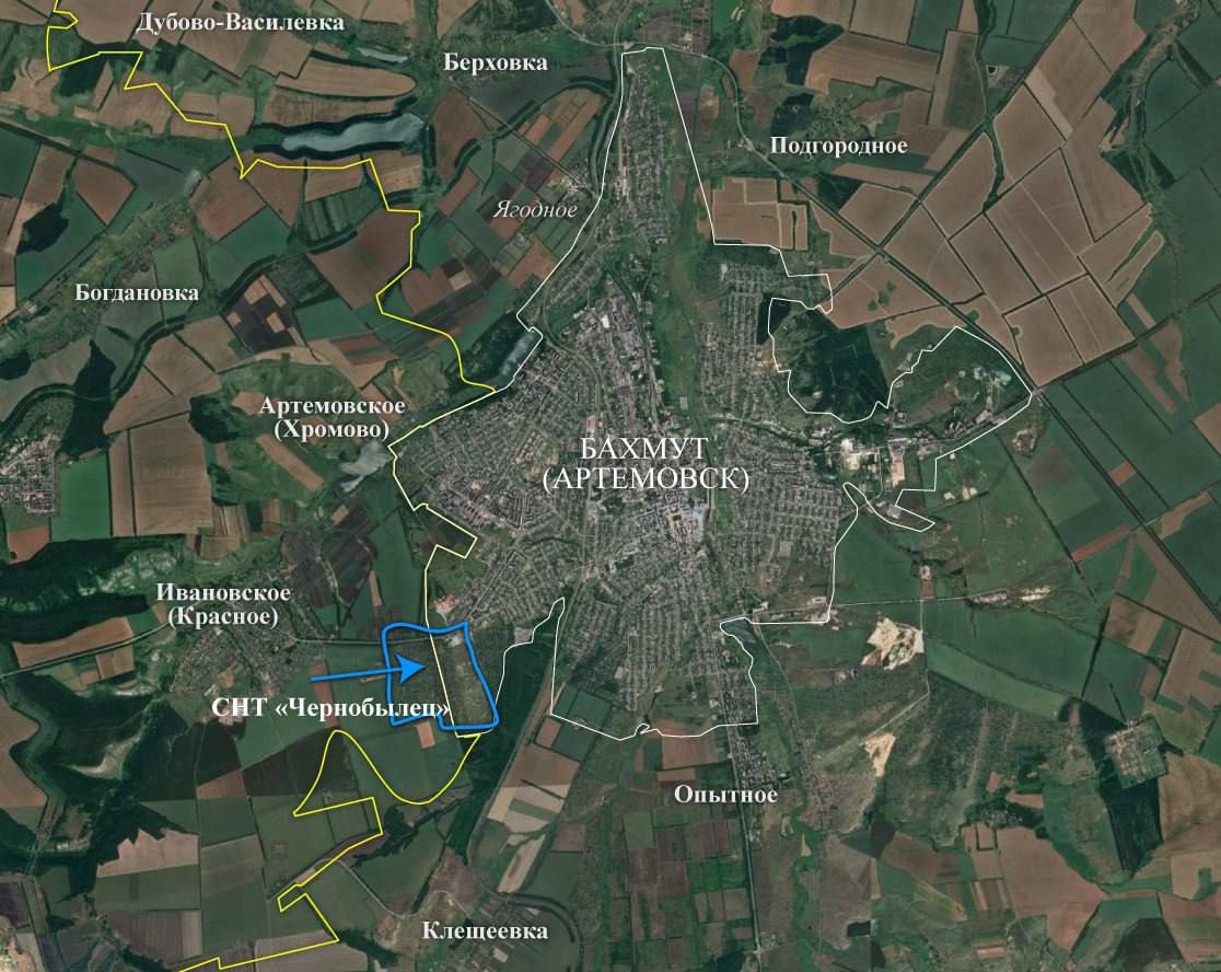 Синим обозначены сады на западной окраине Артёмовска, где установили свои позиции ВСУ.