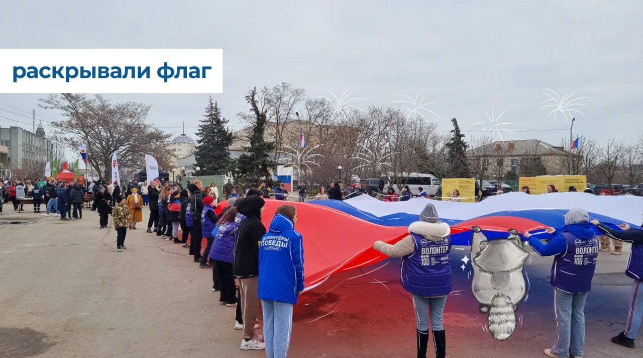 Инициативные жители Донбасса собрались у подножья мемориального комплекса, чтобы поддержать выборы Президента Российской Федерации. Флаги были развёрнуты в виде латинской буквы V.