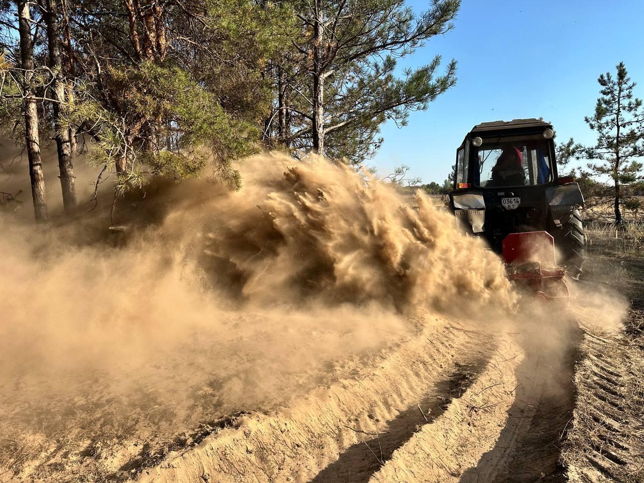 Тракторы теперь работают с грунтомётом – это навесное оборудование, которое за смену делает до 5 километров противопожарных полос. Без химии, без лишней возни – просто расчищает почву так, чтобы огонь не мог пройти дальше. Особенно полезно на наших песчаных землях, где обычные способы часто не дают нужного эффекта.