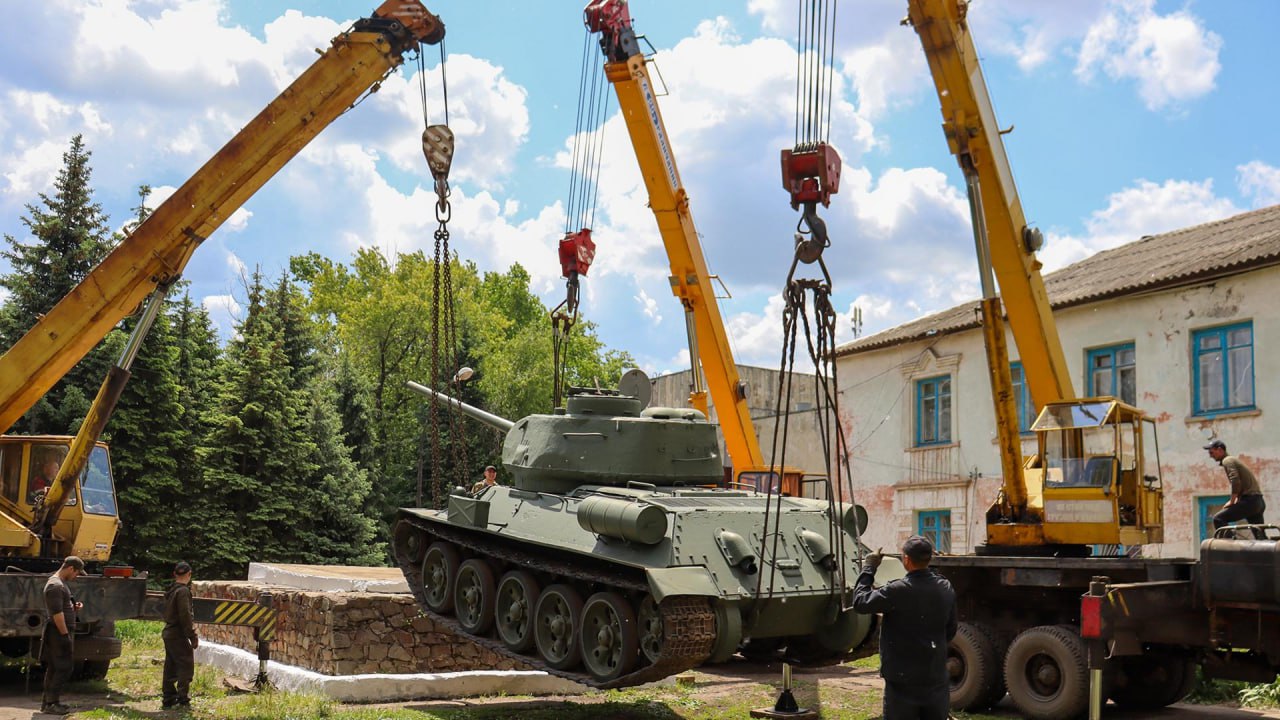 Легендарный танк Т-34 вернулся на свой постамент в Антраците, сообщили в администрации города Телеграм-каналу Луганск 24.