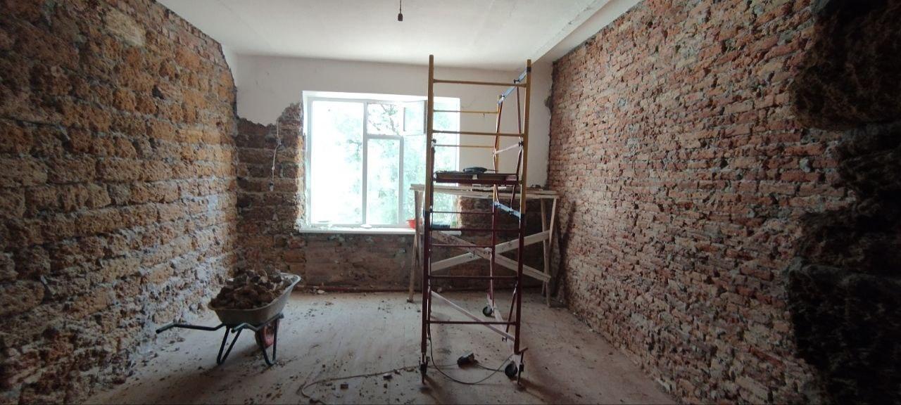 Сейчас специалисты завершают демонтаж штукатурки и напольного покрытия внутри здания, вывозят старый утеплитель, подготавливают лес для поднятия на кровлю и дальнейших работ и собирают опалубку для обустройства армпояса.