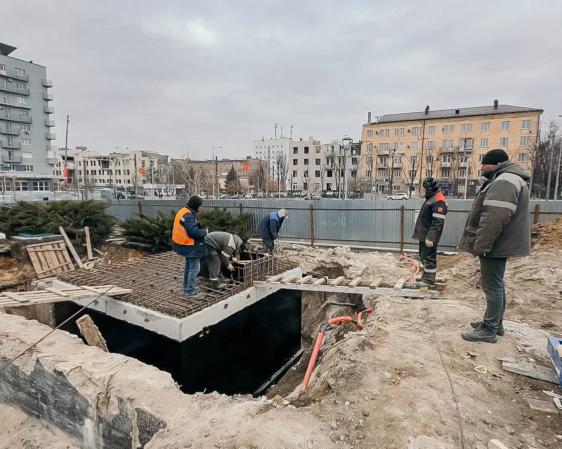 Строители из Северной столицы благоустраивают сквер на проспекте Ленина. Рабочие заняты установкой чаши фонтана, ведутся монолитные работы, устанавливаются камеры под оборудование.