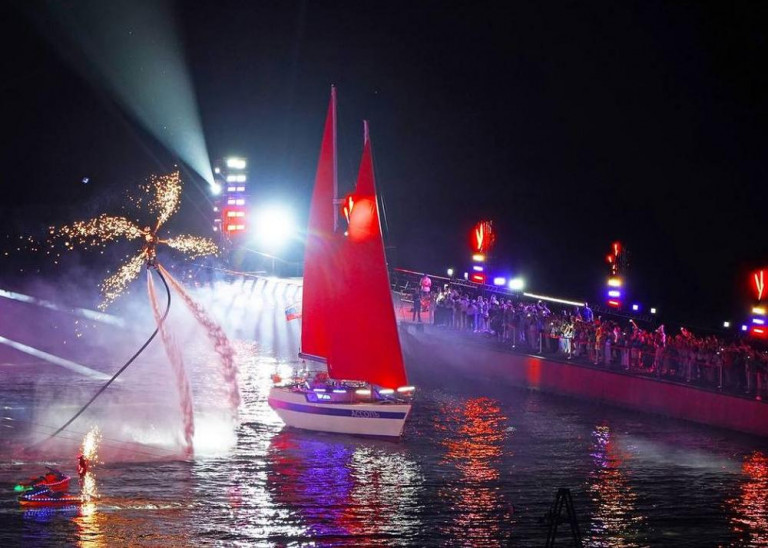 Кульминацией вечера традиционно стал проход вдоль побережья яхты «Ассоль» под алыми парусами. Водную часть торжества сопровождали выступления флайбордистов и пиротехническое шоу.