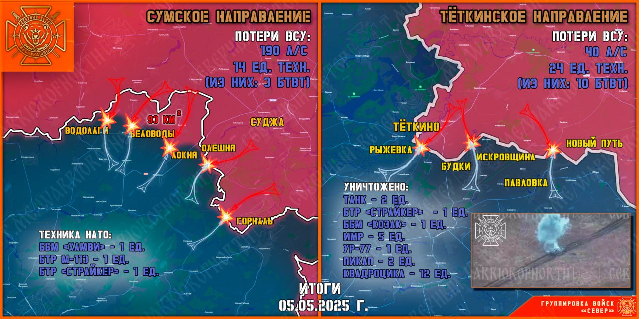 Подразделениями группировки войск «Север» нанесено поражение скоплениям живой силы и техники трёх механизированных, мотопехотной, десантно-штурмовой бригад, штурмового полка ВСУ и трёх бригад теробороны в Сумской и Харьковской областях. Потери ВСУ составили до 225 военнослужащих. Уничтожен склад боеприпасов.