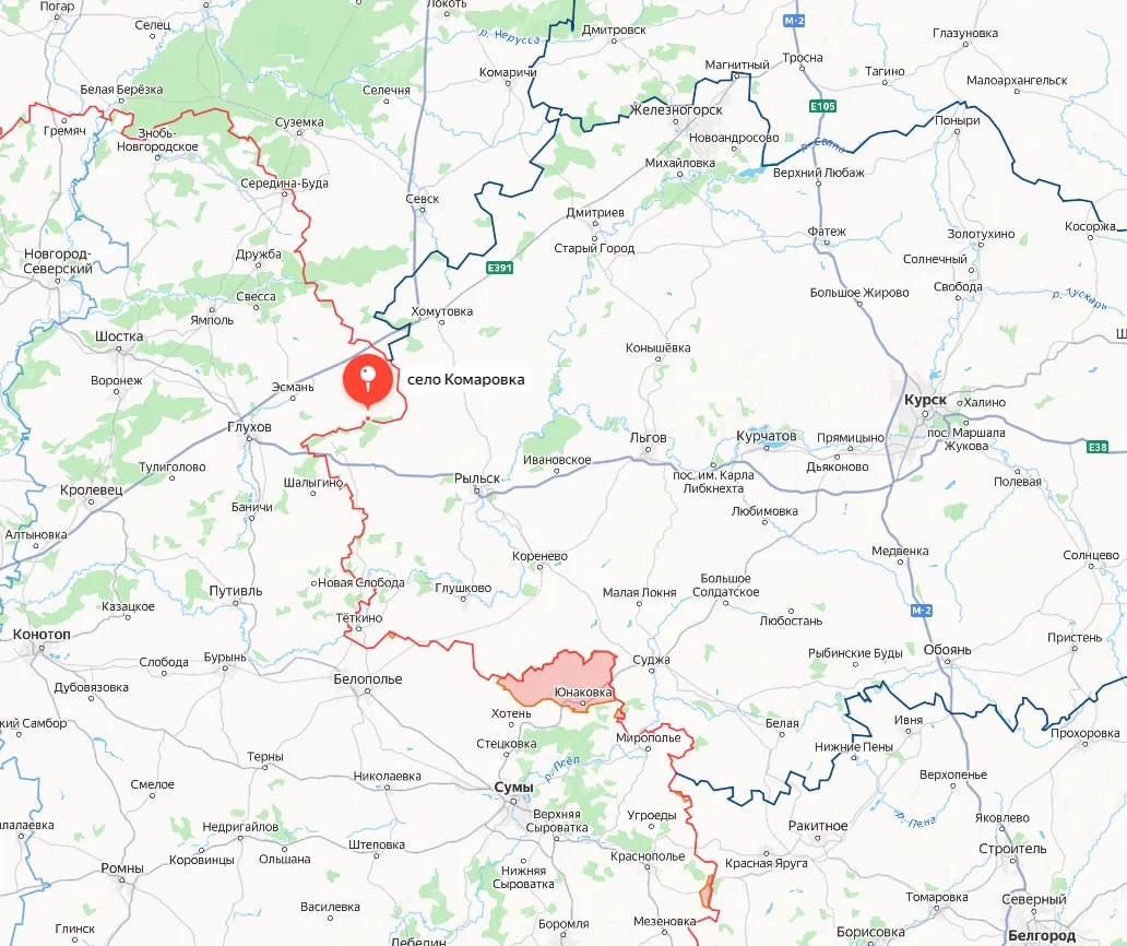 Комаровка – село в Глуховском районе Сумской области с населением около 115 человек. Расположено на правом берегу реки Клевень, по которой проходит граница с Рыльским районом Курской области. Группировка войск «Север» формирует новый плацдарм на территории противника, растягивая оборону ВСУ. При движении от Комаровки на север наши подразделения получат возможность перерезать трассу Е101, идущую с Украины в Брянскую и Курскую области и, тем самым, обезопасить границу на этом участке, пишет военкор Александр Коц.