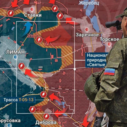 На Краснолиманском направлении поражены цели противника в районе Ильичевки и на логистическом маршруте к Зелёному Клину. Одновременно подразделения ВС РФ при поддержке артиллерии и БПЛА продвигаются с севера и востока в направлении Красного Лимана.