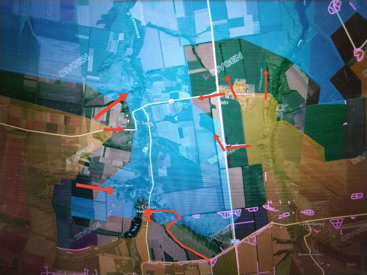 Продолжаются атаки в направлении Зари от Романовки с целью перерезания горловины «кармана». Восточнее Романовки противника ещё удерживает позицию ближе к Леонидовке в посадке. Западнее наши подразделения вышли к северо-западной окраине Зари – Алексеевки. Продолжаются бои в Правдовке (Старой Николаевке) и Игнатовке, пишет военкор Юрий Котенок.