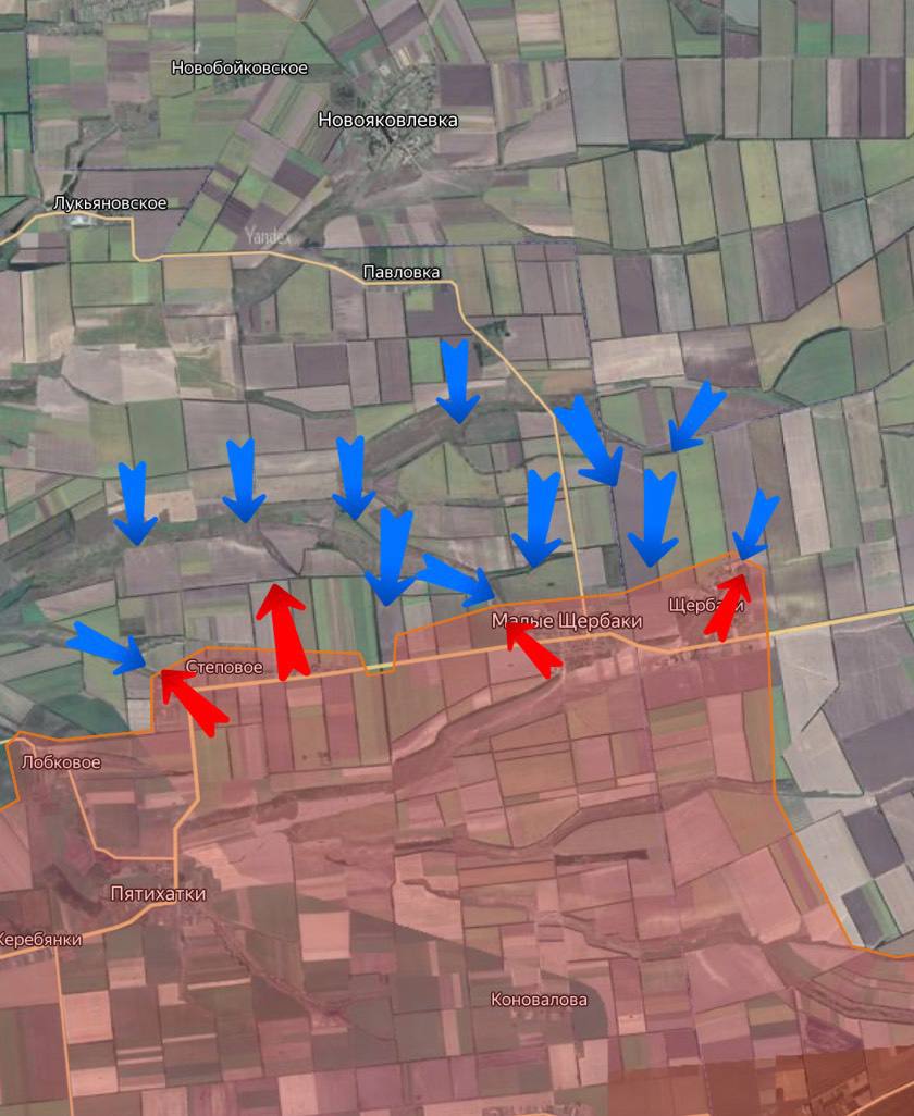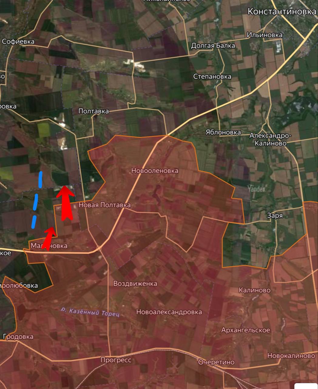 Наши войска продолжают выбивать противника на участке от Малиновки до Новой Полтавки. Севернее Малиновки у противника выстроен ряд укреплённых позиций, которые препятствуют быстрому ведению штурмовых действий с нашей стороны. Активно работаем на участке боеприпасами с высокой проникаемостью. С Южной стороны работаем по позициям врага у Попова Яра, идёт зачистка лесопосадок и блиндажей.