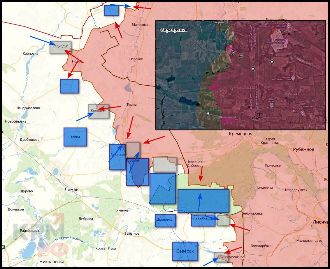 Северское направление. ВС РФ продвинулись в Верхнекаменском, заняв западную часть и центр. Противник удерживает южную окраину. Север населённого пункта остаётся в «серой зоне». Идут удары по позициям ВСУ в районах Серебрянки, Выемки и Звановки. Уничтожены пункты управления БПЛА, артпозиции, РЭБ. В районе Григоровки небольшое продвижение ВС РФ западнее заказника Ковыль. В районе Новодружеской шахты БПЛА ВСУ повредили танк ВС РФ.