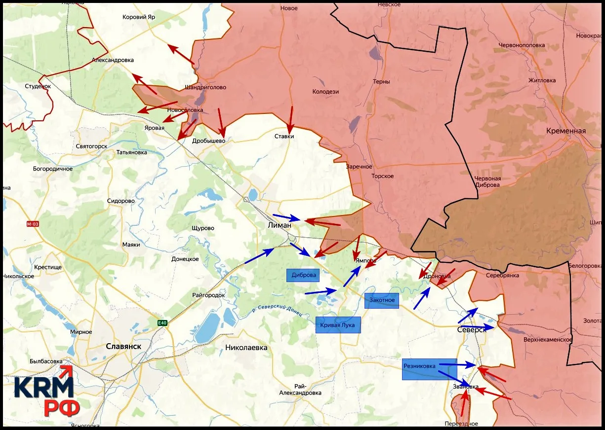 Дорога Ямполь – Красный Лиман перерезана, снабжение Ямполя частично осуществляется через Диброву и район Закотного. Авиация контролирует транспортные пути противника в районах Ямполя и Северска, постепенно лишая его манёвра. В Ямполе продолжаются встречные бои в центральной и южной частях населённого пункта – идёт борьба за выход на ключевой перекрёсток. Отмечается присутствие отдельных групп противника на восточной окраине, однако это – разрозненные подразделения, потерявшие связь. Контроля ВСУ над северной и восточной частями населённого пункта нет, пишет KRM РФ.