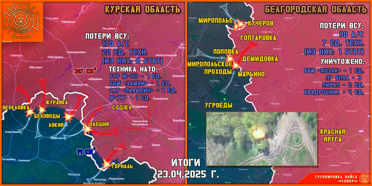 Подразделениями группировки войск «Север» на Белгородском направлении нанесено поражение формированиям трёх механизированных бригад и штурмового полка ВСУ в Сумской области. Потери противника составили свыше 45 военнослужащих. В Курской области нанесено поражение формированиям трёх десантно-штурмовых бригад и бригады территориальной обороны ВСУ. Противник потерял более 150 военнослужащих и два склада боеприпасов.