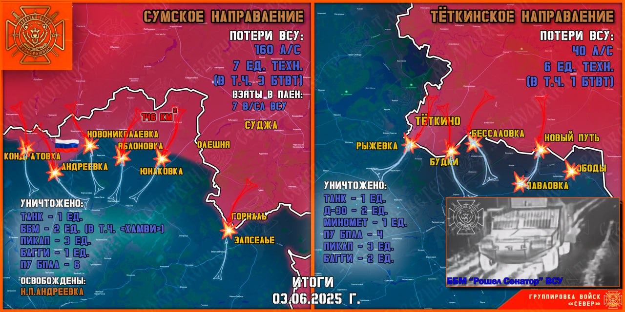 Подразделения ВДВ продолжают зачистку приграничных лесных массивов и перемалывают переброшенные резервы противника в Юнаковке, где противник предпринял безуспешную контратаку, отразив которую, наши десантники продвинулись в северной части населённого пункта. Также десантные подразделения отразили контратаку врага в районе Яблоновки. Всушники с потерями отступили. Мотострелки ведут ожесточённые бои в Новониколаевке, где смогли продвинуться в самом населённом пункте и его окрестностях. Южнее села Горналь враг предпринял очередную контратаку. Штурмовая группа противника попала в нашу засаду: семь оккупантов захвачены в плен, остальные уничтожены при попытке оказать сопротивление, пишет Телеграм-канал «Северный ветер».