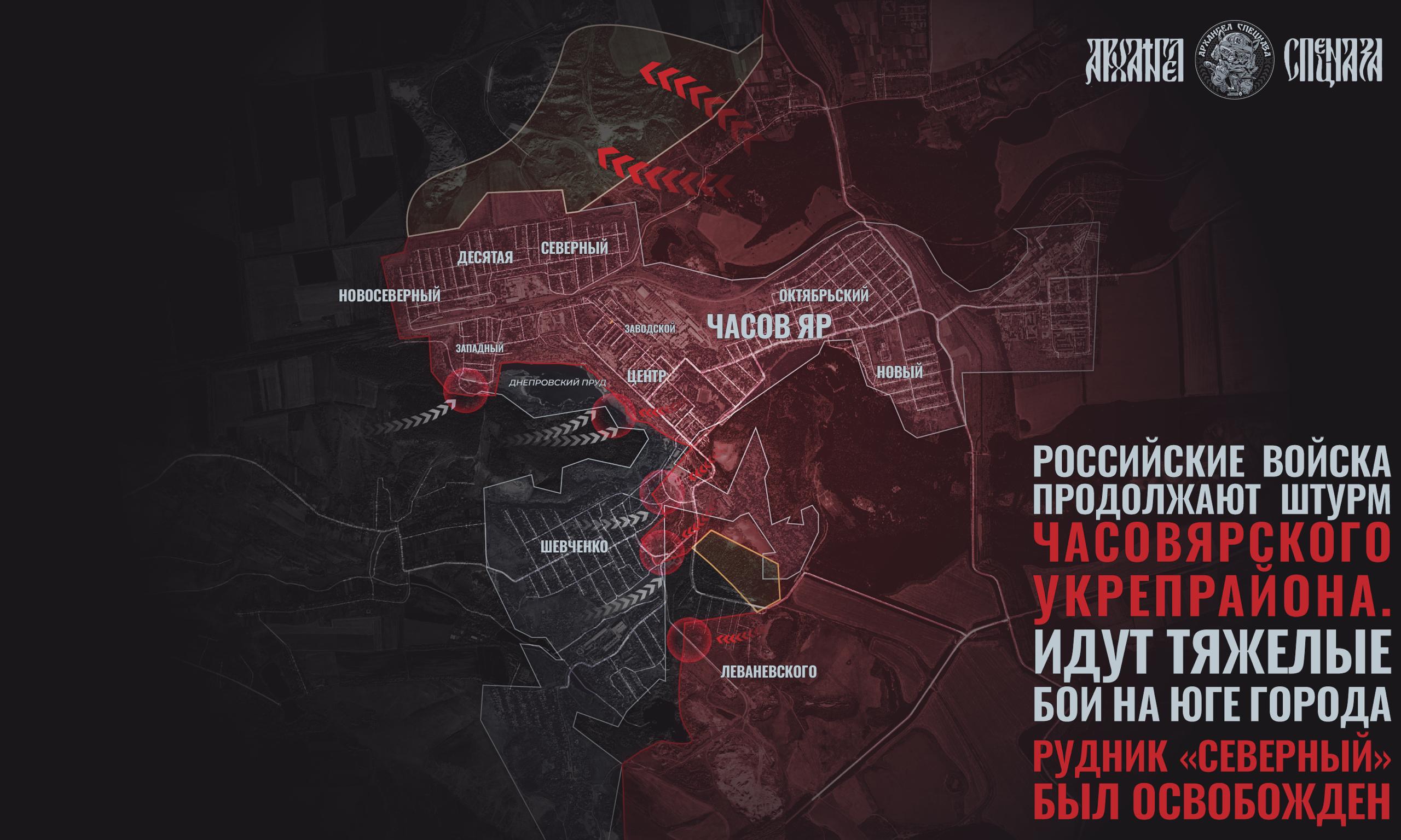 В Часовом Яре продолжается штурм одного из мощнейших укрепрайонов противника. Город из-за перепадов высот, наличия водной и лесистой местности, а также множества предприятий, сам по себе тяжёлая задача. Но наши войска постепенно продвигаются в городе. Основные бои на данный момент перенеслись на окраины Часова Яра, так как штурмовать его через центр крайне затруднительно из-за ударов БПЛА.