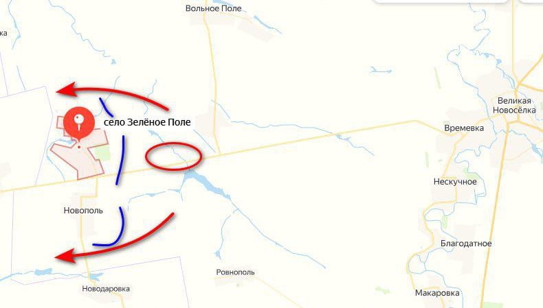 На Южнодонецком направлении наши охватывают с флангов крупные опорники противника в Зелёном Поле и соседнем Новополе. Идёт подготовка к штурму посёлков. За Зелёным Полем уже стык Днепропетровской и Запорожской областей, пишут военнослужащие 105-го стрелкового полка.