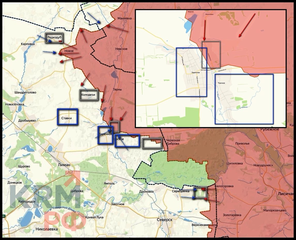 Красный Лиман. В северо-восточной части Редкодуба ВС РФ продвинулись, идёт штурм посёлка. Восточнее Новомихайловки российские силы атакуют вдоль балки Ровчак, ведётся зачистка Леса Войтенков. Западнее окраин Нового и Липового зафиксирован противник, идут встречные бои. В районе лесопосадок между Зелёной Долиной и Колодезями продолжаются усилия по выдавливанию противника с северных окраин Колодезей. В районе Торского ВС РФ ведут наступление с северной и восточной сторон. Сообщается о переброске противником резервов через дамбы в районе Климовских ставков. В Заречном противник оборудует огневые точки, по которым регулярно наносятся удары ВКС РФ.