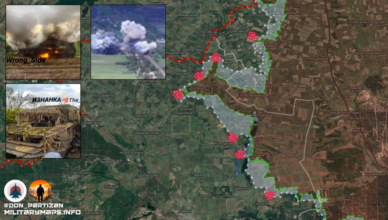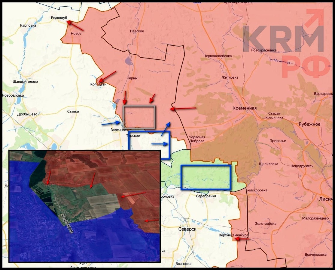 Красный Лиман. В Редкодубе продолжаются боевые действия. Судя по обстановке, ВСУ намерены удерживать населённый пункт до последнего. Потеря Редкодуба в 2022 году стала одной из причин оставления Красного Лимана нашими силами. 283-й и 488-й мотострелковые полки продолжают наступление западнее Тернов, продвигаясь севернее Колодезей с захватом ряда опорных пунктов и выходом в село (район балки Желобки). По сообщениям с места событий, ВС РФ ведут наступательные действия с востока (части 25-й армии) и с севера (части 20-й армии). Штурмовые группы на мотоциклах заходят с северо-востока. Часть населённого пункта находится в серой зоне или под контролем наших сил. Все территории за трассой Кременная – Торское под контролем противника. Продвижение идёт, но оно тяжёлое – враг оказывает упорное сопротивление и активно применяет дроны-камикадзе. Информация о контроле моста Торское – Заречное пока не подтверждается. В районе Грековки ВС РФ уничтожили два гексакоптера типа «Баба-Яга».