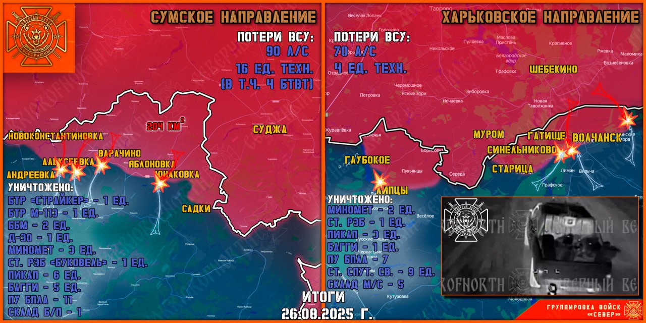 На Сумском направлении штурмовые группы ВДВ совершили стремительный рывок в Юнаковке в южном и юго-западном направлениях. ВСУ наращивают давление на фланги наступающей группировки войск «Север», параллельно доукомплектовывая понёсшие потери бригады. Продолжает активно работать авиация ВКС РФ и расчёты БПЛА «Герань-2». В Юнаковке наши штурмовые подразделения значительно продвинулись, заняв порядка 20 зданий, закрепляются. Общее продвижение составило 800 м. ВСУ провели две контратаки в районе Алексеевки и Андреевки штурмовыми группами.  В ходе стрелковых боёв атаки отражены.