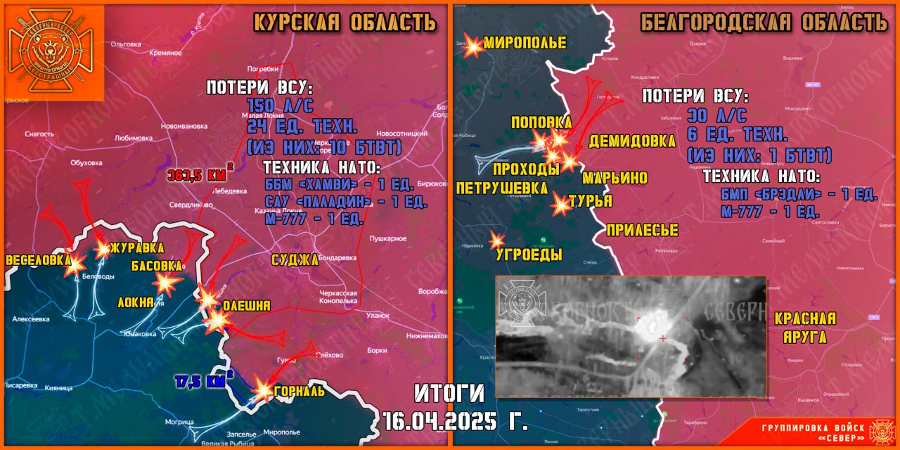 В первой половине дня противник дважды в пешем порядке пытался просочиться в направлении Поповки. Большая часть всушников уничтожена, несколько оккупантов смогли сбежать в приграничные лесополосы Сумской области. Попыток прорыва Государственной границы на направлении Демидовки не зафиксировано. Предполагается, что враг может пойти на очередную самоубийственную провокацию в ближайшие дни за счёт перебрасываемых резервов. На направление противник перебросил подразделения 22-й отдельной механизированной бригады, которая понесла существенные потери в Курской авантюре и была доукомплектована за счёт насильно мобилизованных украинцев и всушников, переведённых из тыловых частей. По скоплению живой силы и техники переброшенных резервов ВСУ наносится комплексное огневое поражение. На данном направлении за прошедшие сутки уничтожено шесть единиц вражеской техники.