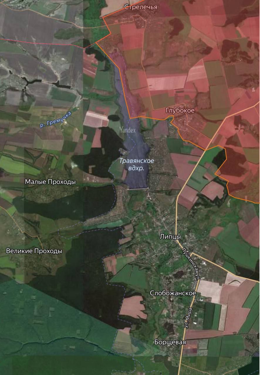 Информация от противника. «ВС РФ обходят Ямполовку с юго-востока, заняли посадку у трассы на Торское и, вероятно, готовятся к броску в северную часть самого Торского. После этого, скорее всего, они развернутся на Заречное, а нашим придётся оттягиваться из леса, чтобы занять оборону Лимана. Также противник занял опорный пункт севернее Мирного и расширил контроль на 2 км, закрепившись на западном берегу Жеребца».