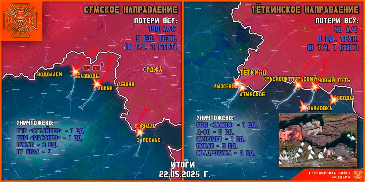 В течение недели подразделения группировки войск «Север» в ходе активных наступательных действий освободили населённый пункт Марьино Сумской области. Ударами авиации, беспилотных летательных аппаратов и огнём артиллерии поражена живая сила и техника танковой, пяти механизированных, двух десантно-штурмовых бригад, двух штурмовых полков ВСУ и четырёх бригад теробороны. За неделю в зоне ответственности группировки войск «Север» потери противника составили свыше 1180 военнослужащих. Уничтожены три склада боеприпасов.
