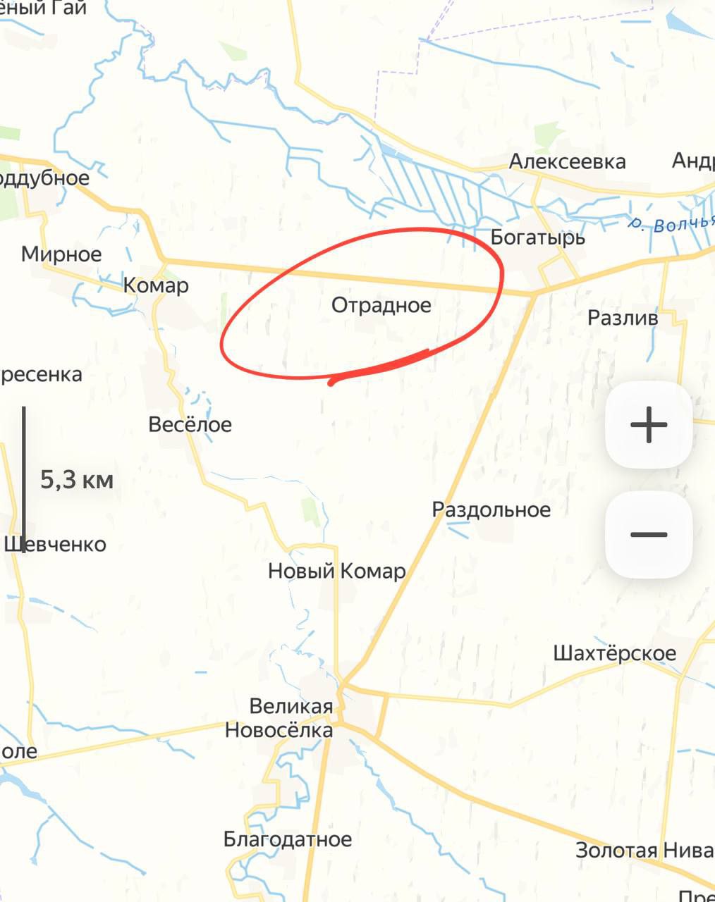 Под нашим устойчивым контролем находится центральная, восточная и южная части Отрадного. Неонацисты отступили на западную окраину и на опорные пункты за посёлком. Де-факто враг начал отход из Отрадного в Комар, пишут военнослужащие 105-го стрелкового полка в своём Телеграм-канале.