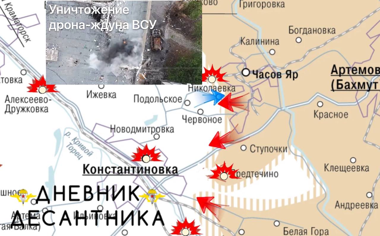 На данном участке фронта ситуация стабильная. В Часовом Яре, где идут позиционные бои, наши подразделения активно наступают на северном и южном рубежах. Часов Яр практически освобождён, осталось выбить ВСУ из территории западнее Днепровского пруда и западных окраин микрорайонов Южный и Шевченко. На окраинах города ВСУ на крышах домов, вдоль дорог, на ровных площадках сажают снаряженные боевой частью дроны в режим ожидания, так называемые «ждуны». Далее с разведдрона подаётся команда и они взлетают и наносят удары по цели. Операторы БПЛА ВДВ ежедневно выявляют и уничтожают такие дроны. В районе Предтечино ВС РФ вернули ранее утраченные позиции между Ступочками и восточной частью Предтечино, продвижение составило более полукилометра, закрепляемся на окраинах населённого пункта, пишет Телеграм-канал «Дневник десантника».