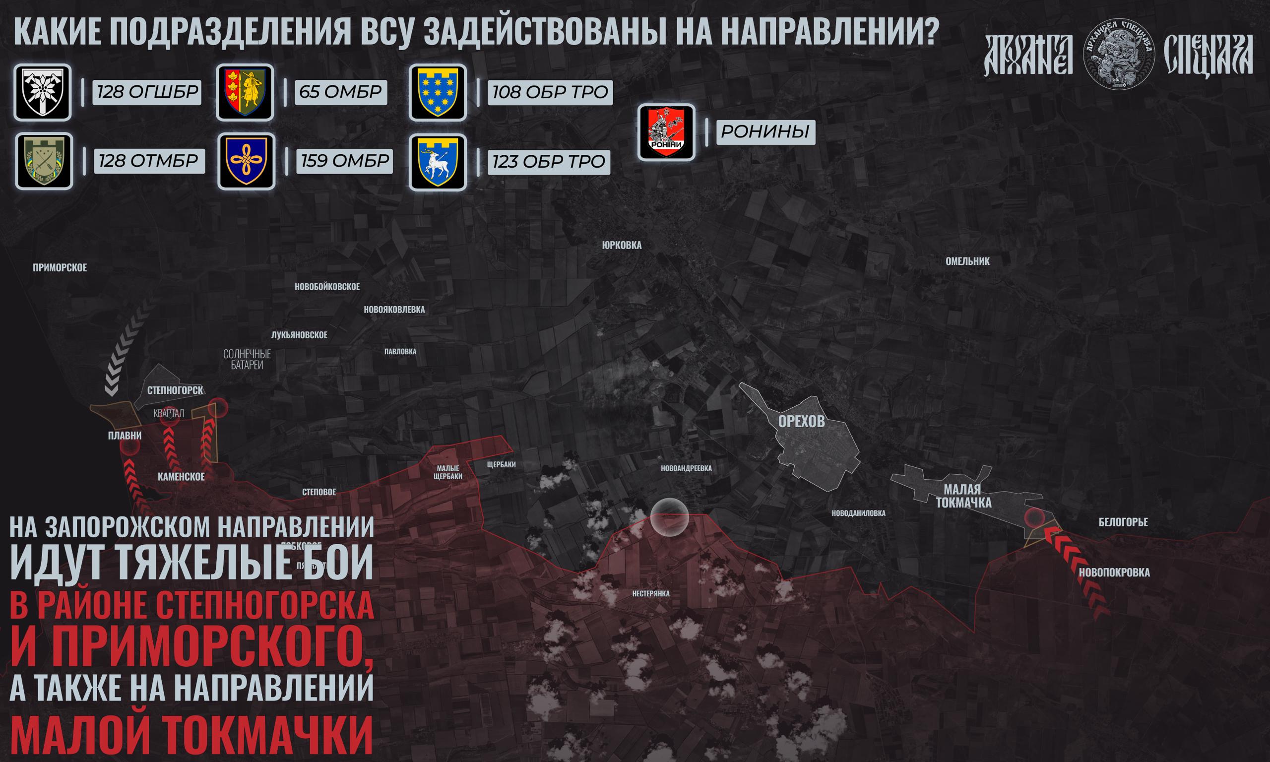 Основные события развернулись на двух участках фронта. В районе Приморского – Степногорска, а также Малой Токмачки к юго-востоку от Орехова. После освобождения Каменского подразделения ВДВ наступают в направлении Степногорска, Лукьяновска, Новояковлевки. Штурм непростой, так как помимо плотной линии обороны у ВСУ сохраняется высокая активность применения БПЛА. На направлении со стороны противника действуют подразделения нацгвардии, 128-я ОГШБр, 65-я ОМБр и 128-я ОТМБр с батальоном БПЛА «Ронины». Фиксируется большое количество FPV-дронов на оптоволокне, а также применение артиллерии. «Ронины» обосновались плотно на участке, атакуя даже тыловые позиции своими дронами. На днях отмечен прилёт FPV самолётного типа по КПП «Высокое» в 40 км от Каменского.