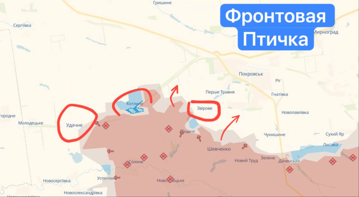 На Покровском направлении российские подразделения вновь активизировались в районе Зелёного и Лысовки. Удалось продвинуться к северо-востоку от Песчаного, закрепившись в лесопосадках вдоль железной дороги. Осуществляются попытки выйти к Зверево с фланга.
