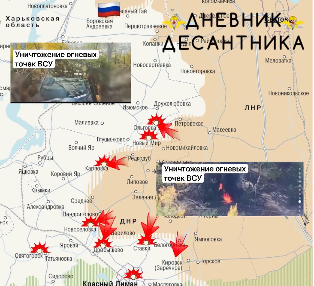 Войска ВС РФ продолжают ломать оборону противника на рубеже Новосёловка – Ставки. В ходе наступления штурмовые группы при поддержке расчётов БПЛА закрепились в Новосёловке и продвинулись южнее села. Также наступаем от Дерилово, беря в охват все территории и лесные посадки южнее между Дерилово и Новосёловкой. В районе Белогоровки наши подразделения в ходе успешных наступательных действий освободили Мирное и взяли под контроль дамбу между Ямполовкой и Мирным. Зачищен участок 5х2 км. По сути, сейчас наша логистика, благодаря освобождению территории, поспособствует скорейшему продвижению и улучшению наших позиций. В районе Ставков также идут бои, наши воины продвигаются с северной стороны населённого пункта, пишет Телеграм-канал «Дневник десантника».