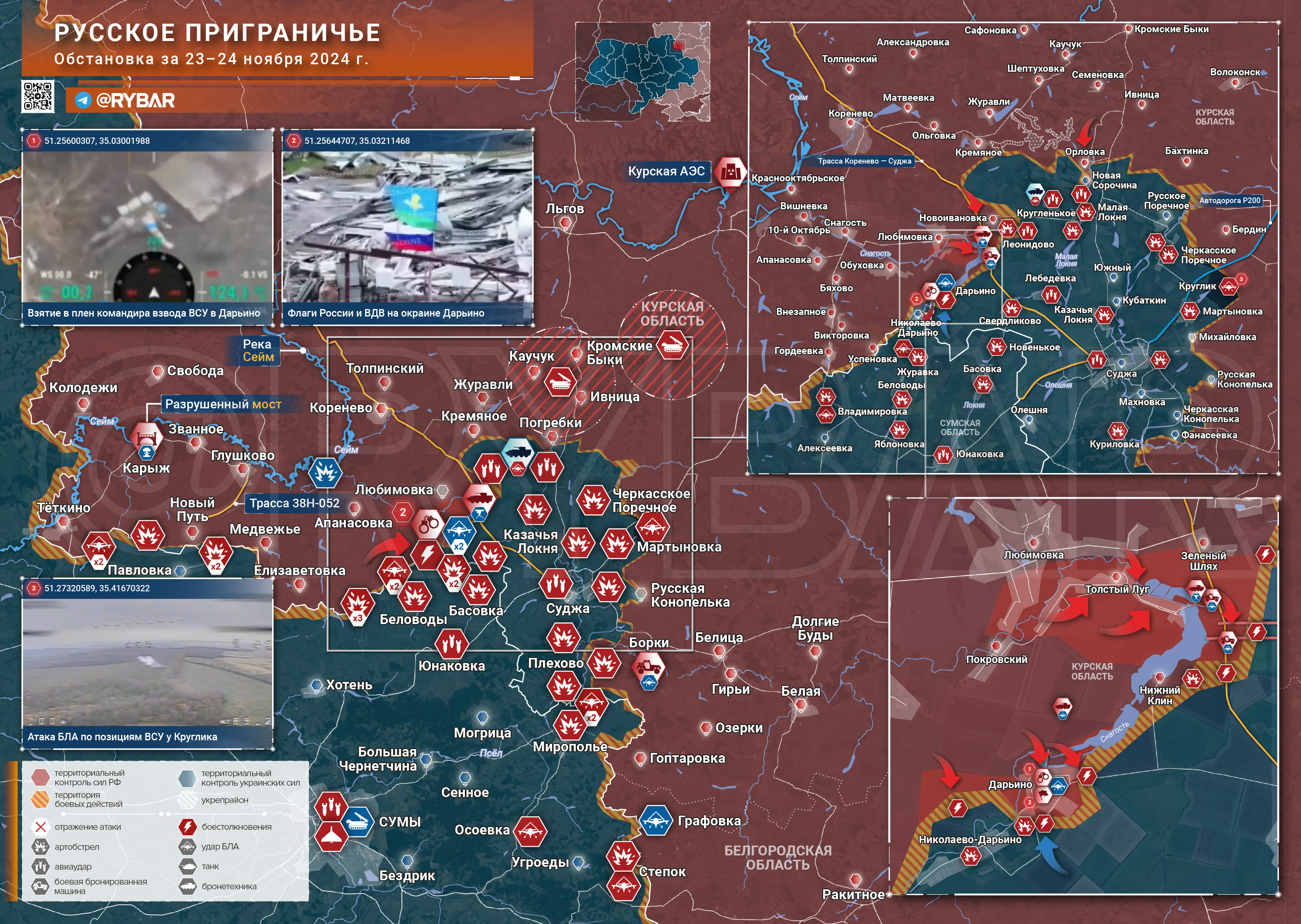 В Суджанском районе российские войска сконцентрировали основные усилия на освобождении села Дарьино. В ходе нескольких атак удалось вначале выбить ВСУ из восточной части села, а затем пленить одного из командиров подразделений ВСУ в районе ферм в ходе ближнего боя.
