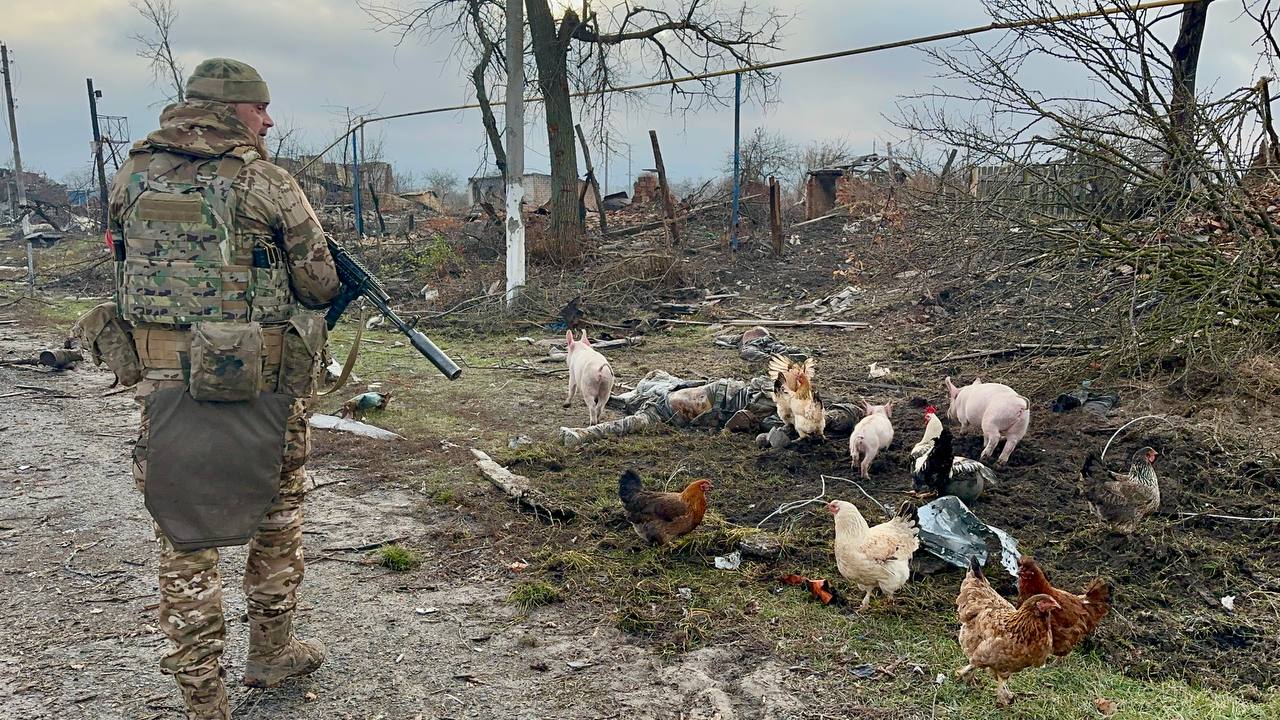 Мы едем по улице некогда цветущего села, от которого остались только руины и обугленные печные трубы. Словно в Хатыни. Противнику было важно удержаться здесь, на пересечении дорог. Отсюда он не оставлял планов продвинуться на райцентр Коренево. И тут он понёс, пожалуй, самые ощутимые потери. Тела с синим скотчем на рукавах до сих пор не убраны. Они валяются по обочинам, в разбитых дворах и хатах. Вокруг трупов копошатся предоставленные сами себе куры и свиньи, рассказывает военкор.