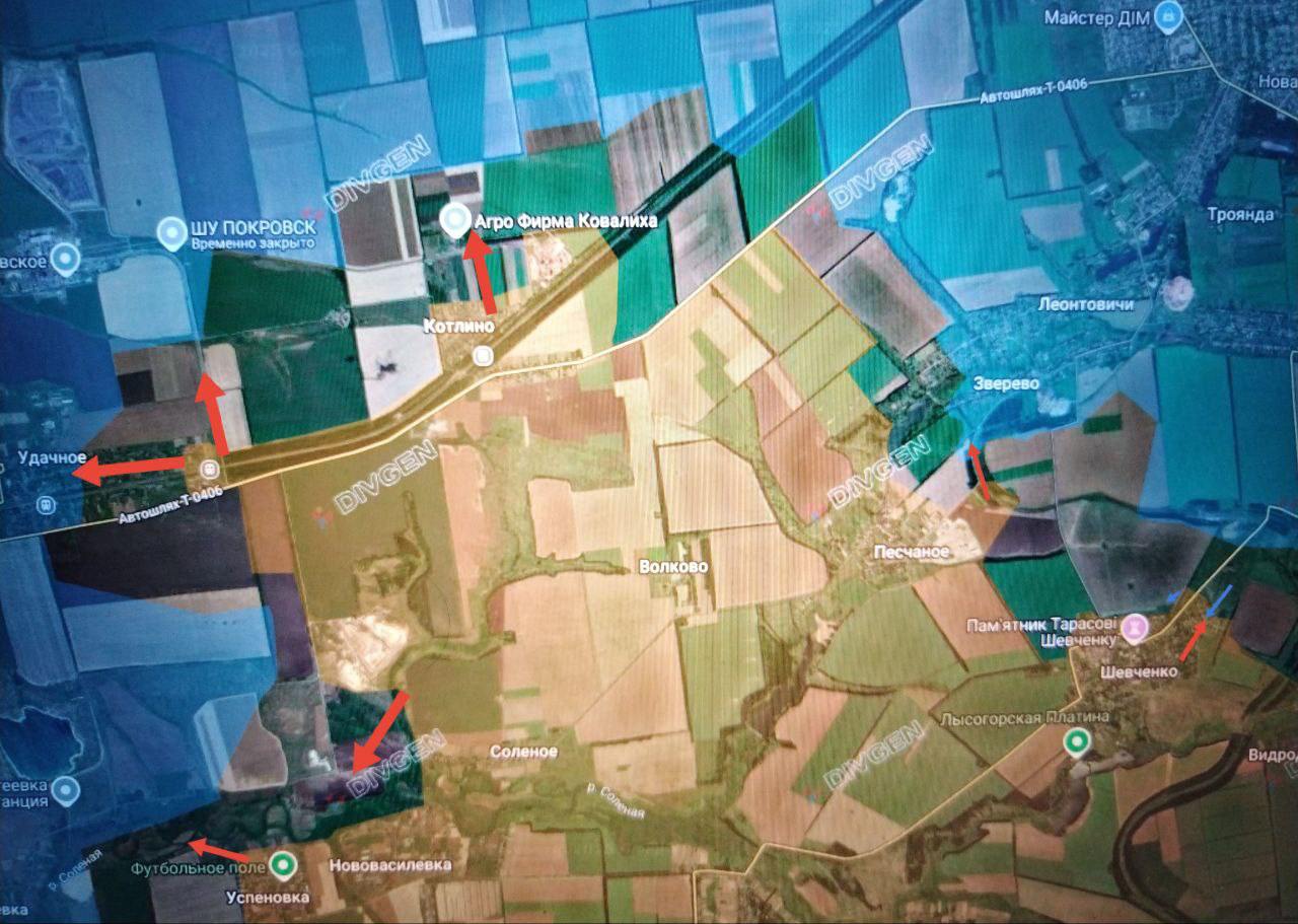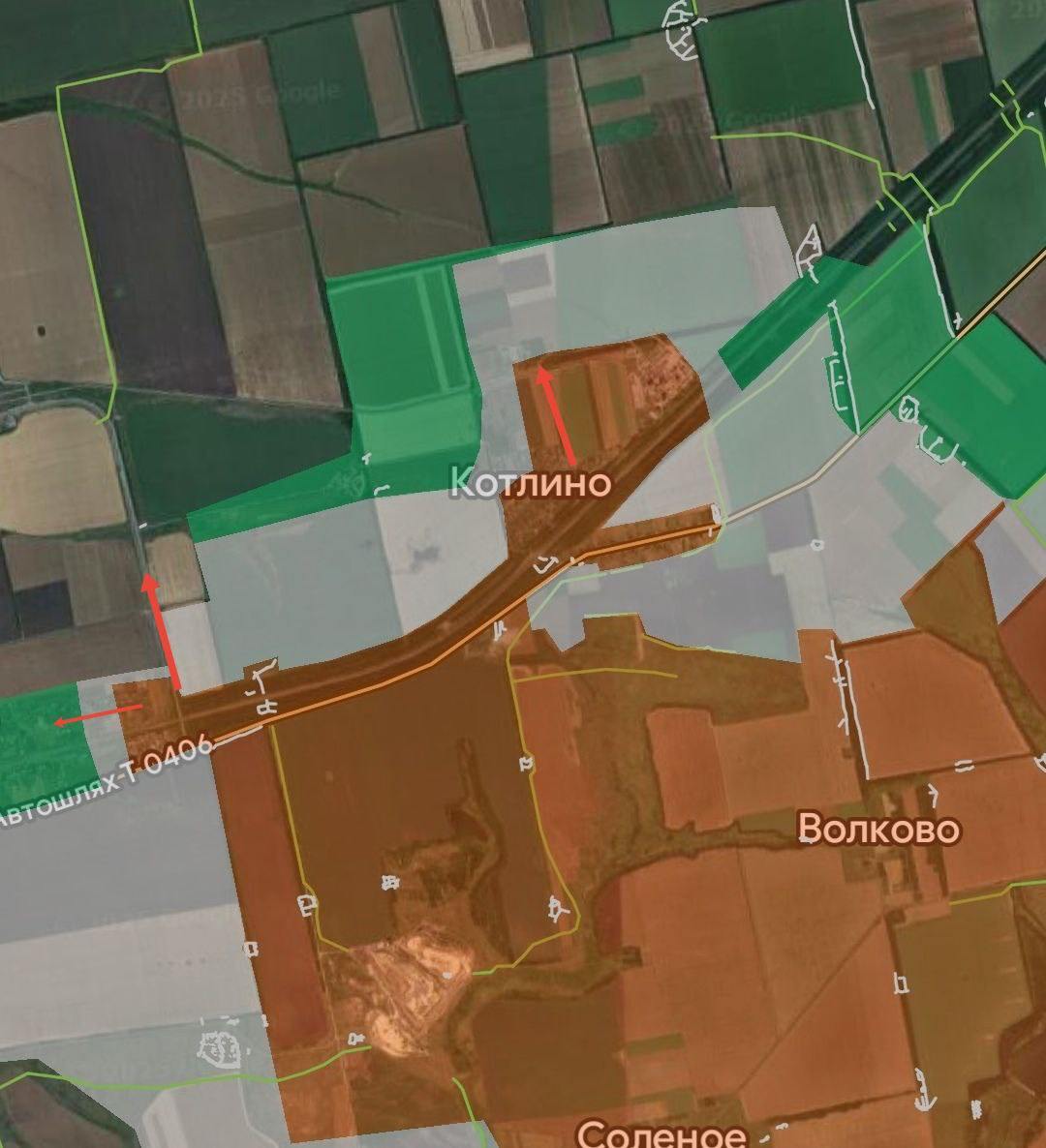 Идут ожесточённые, порой встречные, бои с использованием большого количества БПЛА. Информация о том, что наши подразделения выбиты из Котлино, не соответствует действительности. В северо-восточной населённика части идут встречные бои. Однако наши штурмовые подразделения смогли восстановить положение в районе агрофирмы севернее.