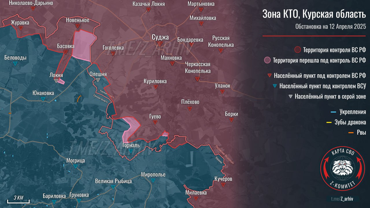 ВС РФ завершают Курскую операцию, продвигаясь к населённому пункту Горналь и заняв ряд лесополос и посадок на западе и юго-западе Суджанского района. Отдельные группы ВСУ пытаются оказать сопротивление, но это выглядит как попытка удержать наступающие порядки ВС РФ для выигрыша времени в подготовке линии обороны на территории Сумской области. Вопрос об освобождении оставшихся квадратных километров Суджанского района, скорее всего, решится в течение двух недель. Курская авантюра Зеленского и Сырского подошла к концу и, как это всегда бывает в украинском обществе, мимолётная «перемога» превратилась в «зраду».