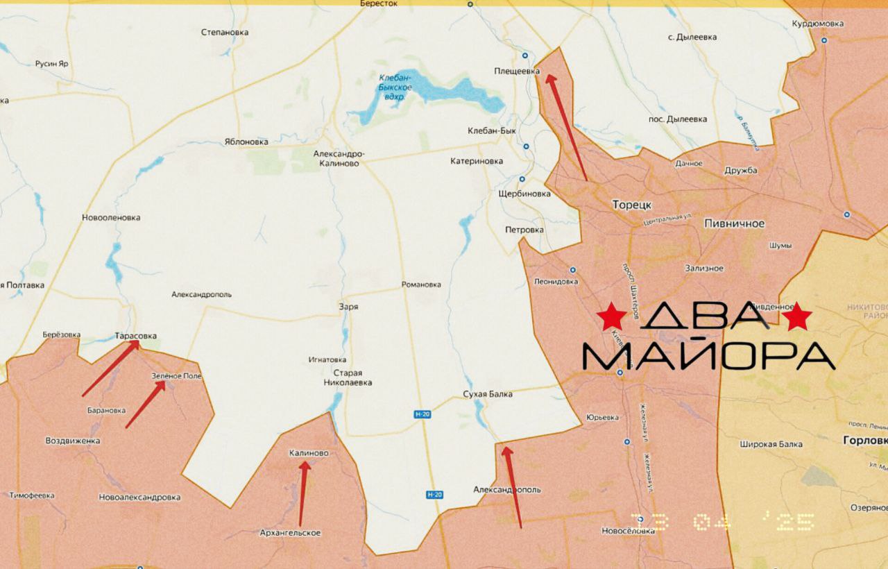 Важными стали сведения об освобождении Калиново юго-западнее Дзержинска (Торецка), полученные на днях. Вместе со взятием Александрополя и Пантелеймоновки, устремлениям к Сухой Балке через Валентиновку, ситуация указывает на планы Армии России по выходу к Константиновке с юга. Также идут бои за Тарасовку и у Зелёного Поля, но враг оказывает ожесточённое сопротивление. Несмотря на скептические оценки о масштабах прорыва к Нелеповке (не исключено, что это были наши диверсионно-разведывательные группы для затруднения логистики врага), наступательные действия идут на нескольких участках сразу, пишет Телеграм-канал «Два майора».