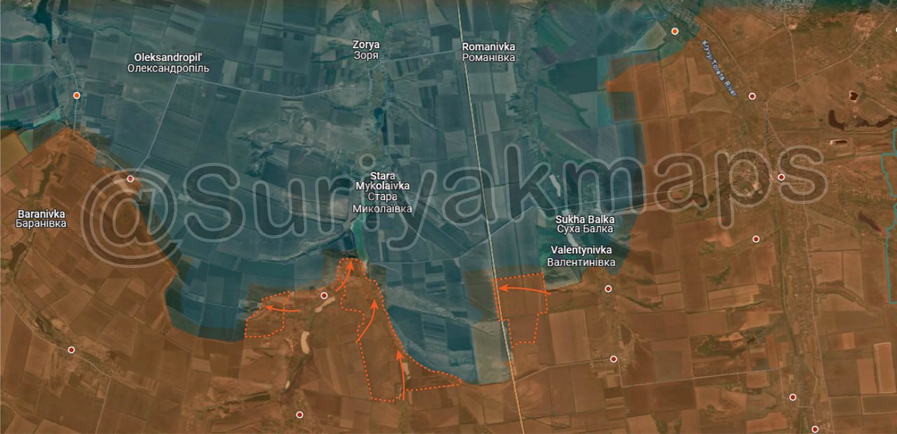 Александрополей на Константиновском направлении два: один является бывшим селом Розовка и уже освобождён, за второй прямо сейчас идут бои. Взятие Александрополя открывает прямой выход на посёлок Заря, лежащий на рокадной трассе снабжения гарнизона нацистов в Сухой Балке. Взятие Зари позволит осуществить физический контроль над трассами и окружить группировку ВСУ в районе Сухой Балки, пишут военнослужащие 105-го стрелкового полка.
