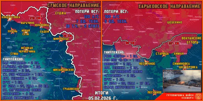 В течение недели в результате активных наступательных действий подразделений группировки войск «Север» освобожден населённый пункт Зелёное Харьковской области, а 5 февраля взят под контроль населённый пункт Поповка Сумской области. Нанесено поражение формированиям ВСУ, двух бригад теробороны, бригады нацгвардии и двух пограничных отрядов погранслужбы Украины. Противник потерял более 1415 военнослужащих.
