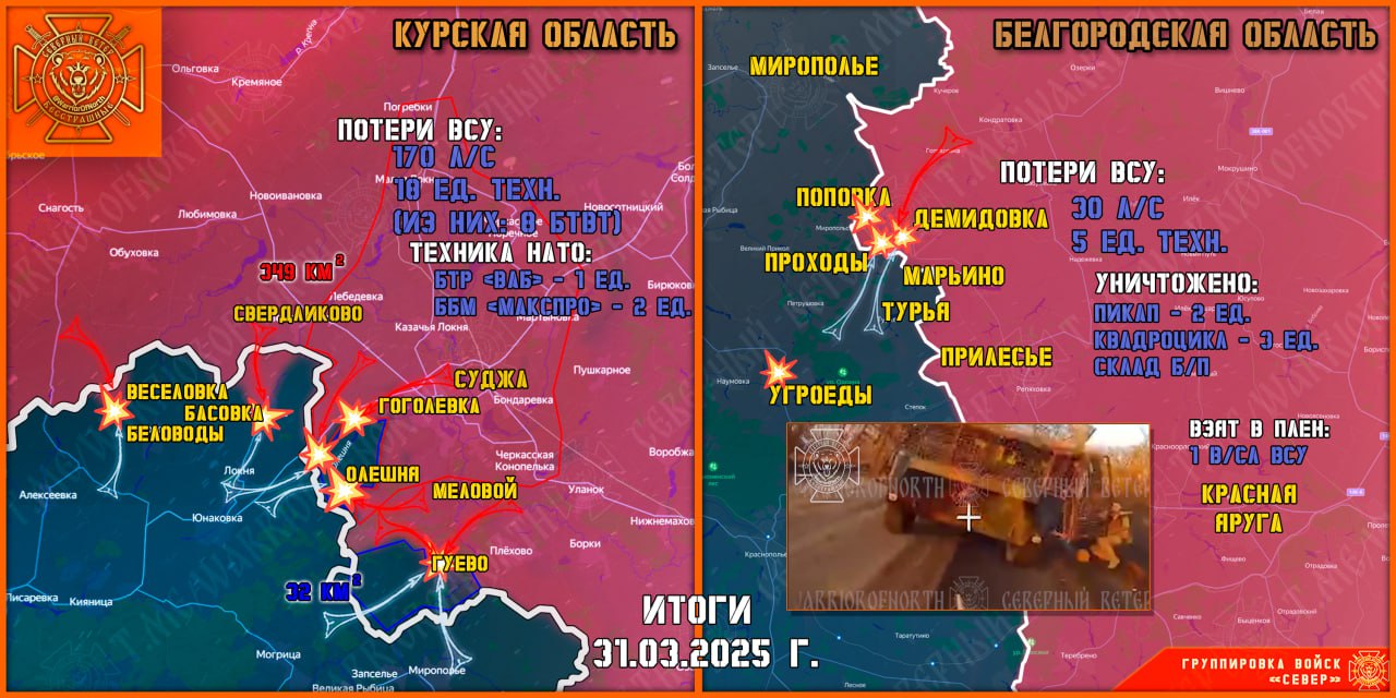 На западном фланге по состоянию на 30 марта в результате серии атак бойцы ВС РФ заняли Веселовку, водрузив на одной из вышек связи в населённом пункте российский флаг. Продвижение в направлении Юнаковки с северо-запада позволит не только достичь успеха в Басовке, где российские войска ведут бои, опираясь на занятые позиции в Новеньком, но и ускорить освобождение территории Курской области в связи с заходом в тыл ВСУ, пишет Телеграм-канал «Рыбарь».