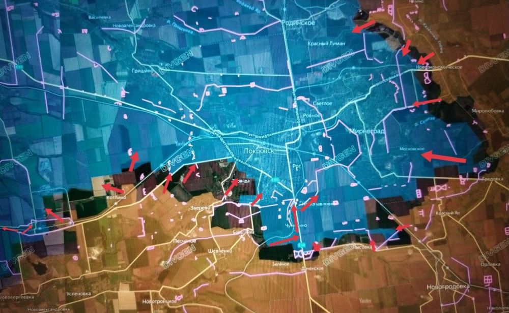 Подразделения группировки войск «Центр» продолжают наступление. В районе Удачного и Котлино атакуют в направлении шахты «Покровская», а также – севернее Удачного и северо-западнее Котлино, в направлении Молодецкого, западной окраины Покровска и в направлении Гришино. Со стороны Зверево наши бойцы зачищают северную часть населённого пункта Перше Травня (Леонтовичи), ведут бои в микрорайоне Троянда и атакуют в южной части Покровска. Со стороны Чунишино вошли в Новопавловку и пытаются вклиниться между Покровском и Мирноградом (Димитровым). Со стороны Гродовки и Новоэкономического идёт атака в районе Проминя и Московского, где наши подразделения продвигаются к юго-восточной и восточной окраинам Мирнограда. Идут бои и в восточной части Красного Лимана, пишет военкор Юрий Котенок.