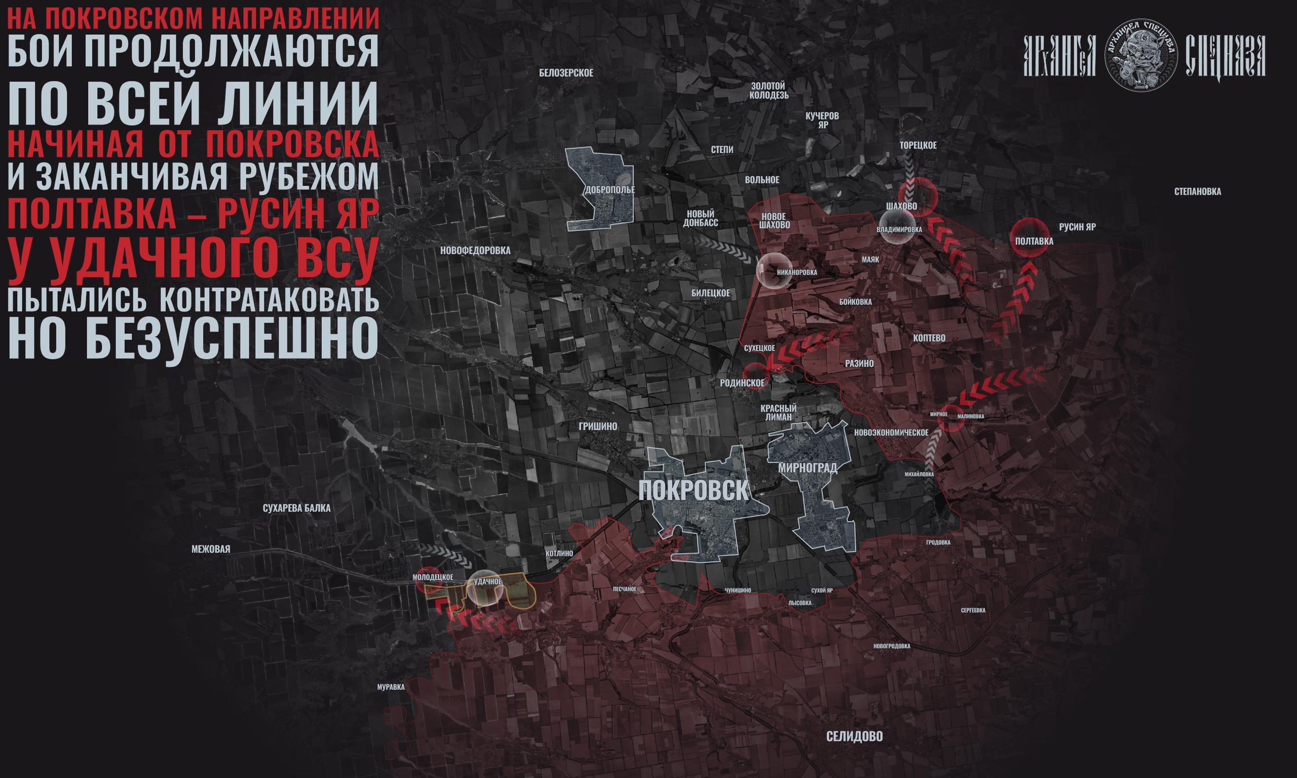 В районе Покровска обстановка развивается интенсивно. Вчера основное внимание было приковано к Удачному, где ВСУ якобы перешли в атаку. Они вывесили свой флаг на западной окраине Удачного, заявив об освобождении села, чего на самом деле не было. В итоге их попытка привела к ещё большим потерям, а ВС РФ продвинулись к Молодецкому. Севернее Покровска в районе Родинского бои идут у шахты. ВСУ перебросили для усиления свои подразделения. Так же противник предпринимает попытки наступательных действий на Мирное, засылая малые группы к этому селу. На днях была пресечена попытка прорыва в пешем порядке, личный состав противника был уничтожен.