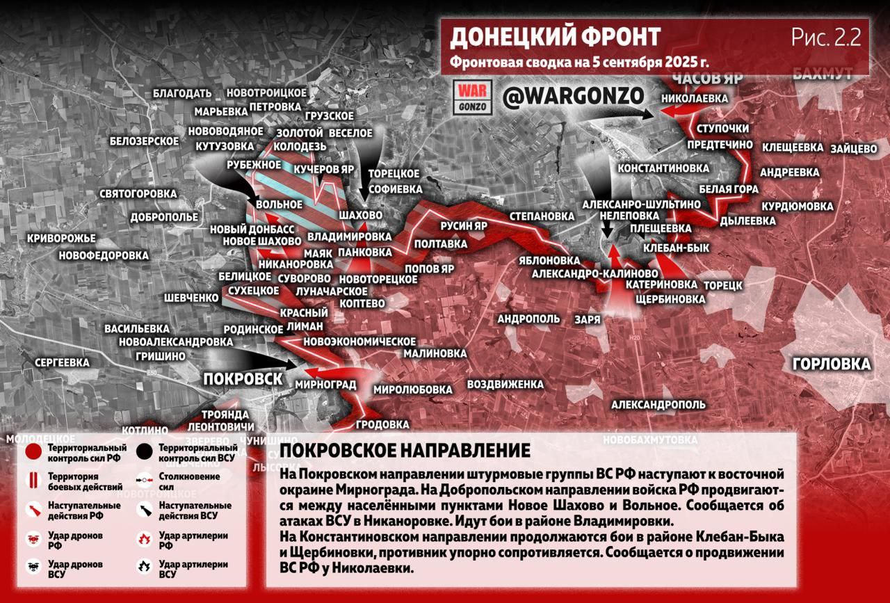 На Покровском направлении штурмовые группы ВС РФ наступают к восточной окраине Мирнограда (Димитрова). На Добропольском участке фронта войска РФ продвигаются между населёнными пунктами Новое Шахово и Вольное. Сообщается об атаках ВСУ в Никаноровке. Идут бои в районе Владимировки, пишет Телеграм-канал WarGonzo.