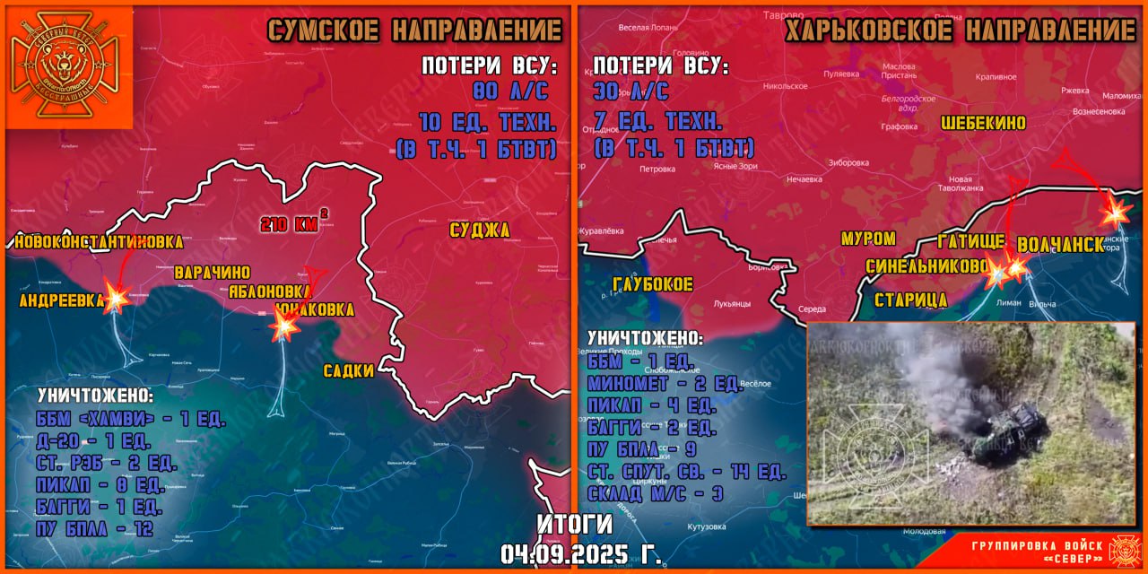 На Сумском направлении продолжаются ожесточённые бои в районе Юнаковки. Противник контратакует фланги наступающей группировки войск «Север». Российская авиация и ракетчики работают по выявленным целям ВСУ по всему участку фронта. Штурмовые группы ВДВ продвинулись в Юнаковке в южном направлении на 100метров, овладели и закрепились в шести домовладениях. Противник провёл одну контратаку в районе Андреевки силами, успеха не имел, с потерями отошёл на исходные позиции. В помощь к понесшёму тяжёлые потери 225-му штурмовому полку на Сумское направление перебрасывают восстановившую боеспособность 22-ю отдельную бригаду из состава отдельной президентской бригады, которкоторая ранее участвовала во вторжении в Курскую область и была разбита в районе Гуево.