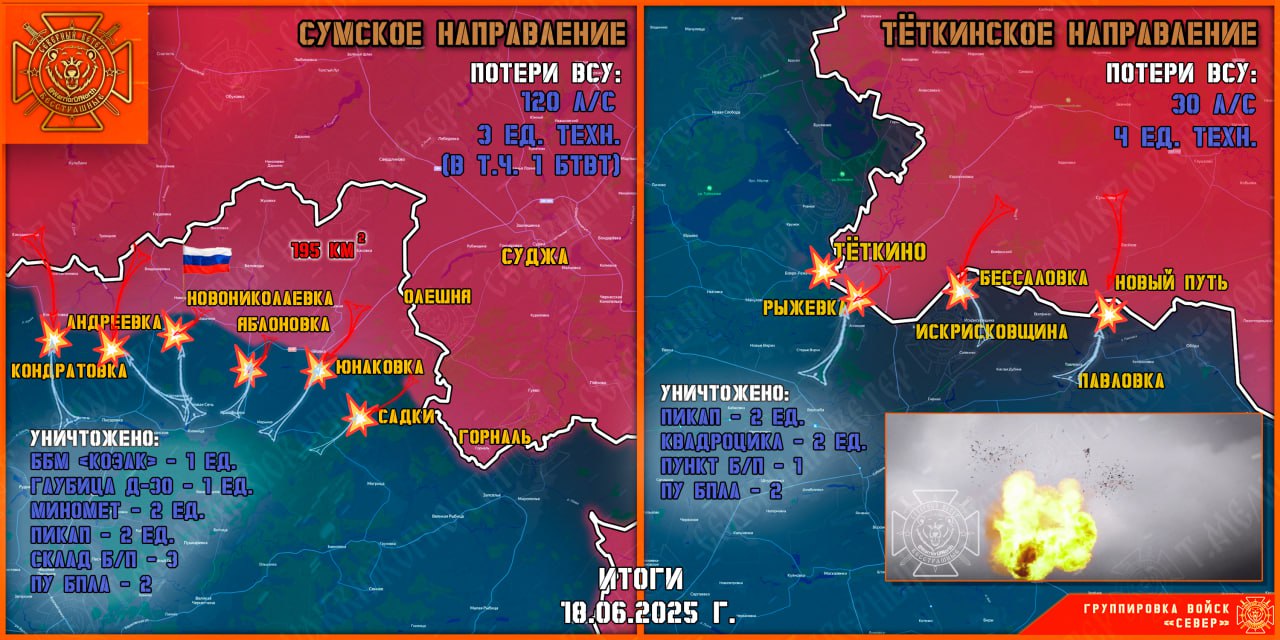 Из окрестностей Рыжевки неонацисты «Айдара» вчера утром вновь попытались просочиться в направлении Тёткино. В ходе стрелкового боя и под ударами наших операторов БПЛА оккупанты с потерями бежали в обратном направлении. Ближе к полудню штурмовая группа 225-го штурмового полка пыталась прорваться на нашу территорию из Бессаловки. В результате стрелкового боя и применения сбросов с коптеров всушники уничтожены. Также оккупанты из состава 225-го штурмового полка пытались пересечь госграницу в районе Искрисковщины. Наши подразделения ВДВ ударами FPV-дронов уничтожили больше половины личного состава противника, остальные сбежали вглубь украинской территории. В обеденное время штурмовая группа 425-го штурмового полка «Скала» выдвинулась в направлении посёлка Новый Путь (Курская область). В результате комплексного огневого поражения  оккупанты уничтожены.