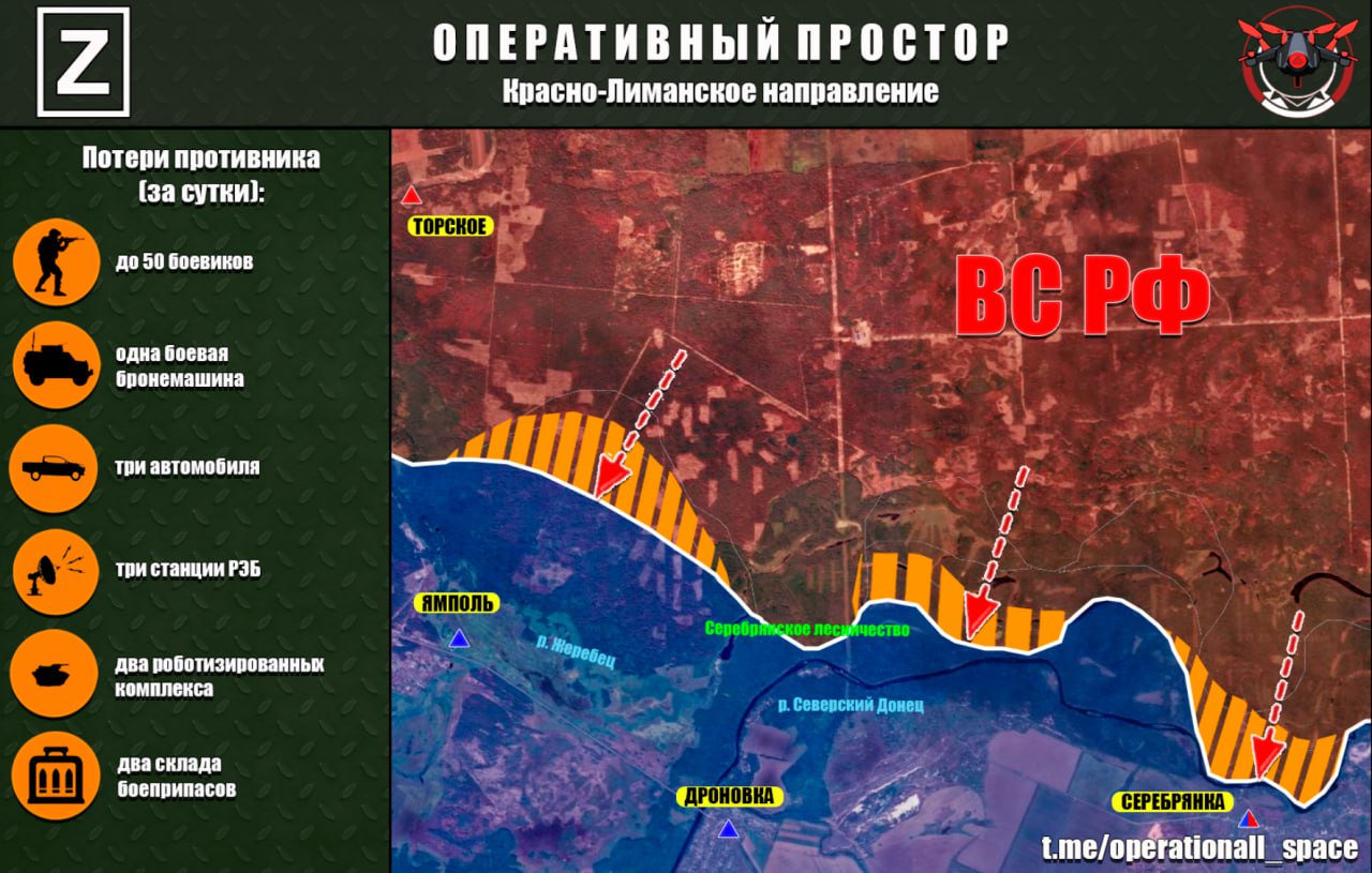 На Краснолиманском направлении ВС РФ завершают зачистку и разгром противника в Серебрянском лесничестве. Подразделения группировки войск «Запад» практически вплотную дошли до реки Северский Донец и стремительно продвигаются в направлении населённого пункта Ямполь, пишет Телеграм-канал «Оперативный простор».